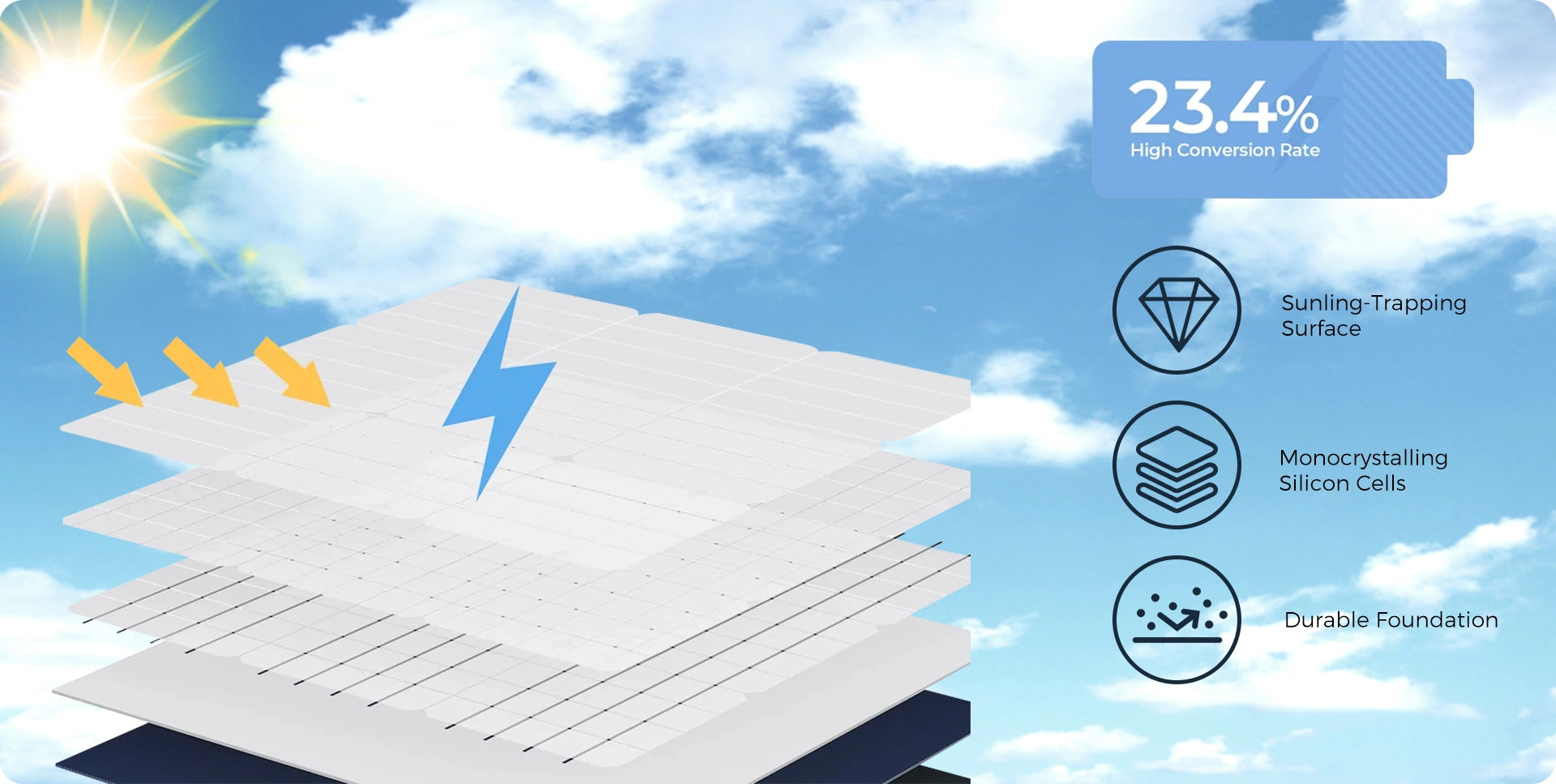Costruito con celle solari monocristalline, il pannello solare SP200 converte fino al 23,4% della luce solare in energia solare, caricando i generatori solari anche nelle giornate nuvolose.